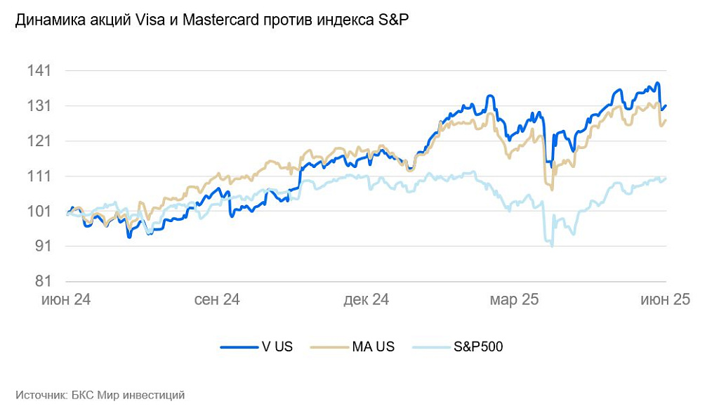 Новость о возможном запуске стейблкоинов и продвижение GENIUS Act, безусловно, способны в среднесрочной перспективе повлиять на темпы роста комиссионной выручки таких компаний, как Visa и Mastercard, особенно в контексте конкуренции за роль ключевых посредников в цифровых платежах. Однако, учитывая их устойчивые бизнес-модели с высокими барьерами по входу, развитую инфраструктуру и активное участие в развитии цифровых валют, мы считаем риски для рыночных позиций и прибыльности компаний ограниченными на горизонте 3–5 лет. Акции обеих компаний остаются достаточно высоко оцененными и торгуются близко к справедливым уровням, что сохраняет нашу инвестиционную рекомендацию актуальной.