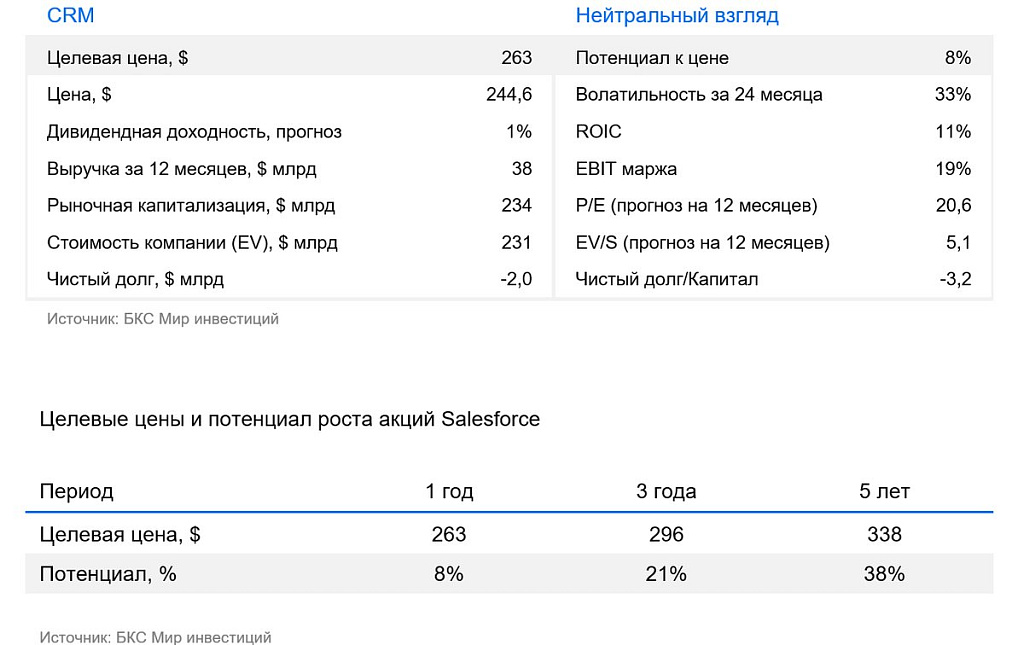У нас «Нейтральный» взгляд на Salesforce, ведущего игрока на рынке облачных CRM-систем. Безоговорочный лидер корпоративного ПО активно внедряет ИИ-агентов. Это делает решения компании более эффективными. Но рост бизнеса замедляется, налицо структурные проблемы. Наша целевая цена на горизонте 12 месяцев — $263.