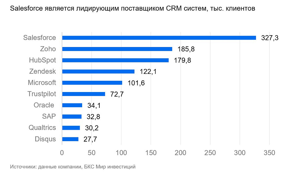 Согласно данным HG, лидером в отрасли остается Salesforce с крупнейшей клиентской базой — 327 тыс. организаций. На втором и третьем местах находятся Zoho и HubSpot с 185,8 тыс. и 179,8 тыс. клиентами, соответственно. Они формируют второй эшелон конкурентов.