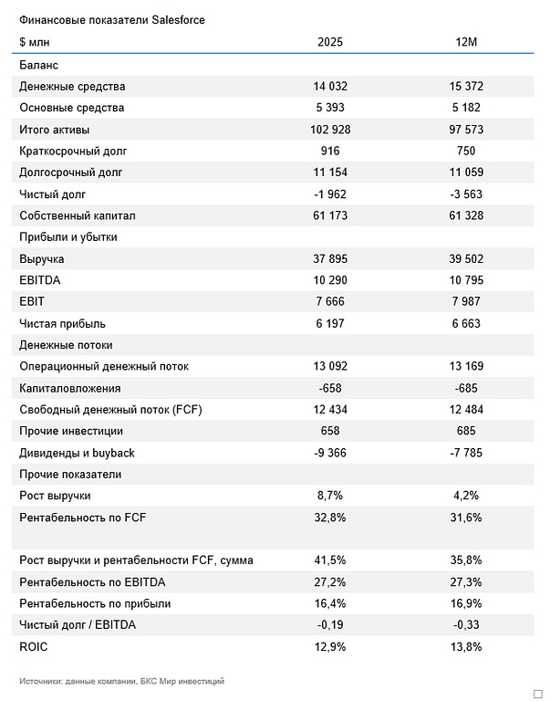 Рост выручки Salesforce заметно замедлился: по итогам 2025 финансового года (смещенный) лишь 9% г/г до $37,9 млрд против двузначных уровней ранее. Но снижение себестоимости помогло повысить валовую маржу до 77% с 73–75% в прошлые годы. Доля всех статей операционных расходов в выручке сократилась, что позволило повысить операционную маржу до 19% (14% в 2024 г. и 3% в 2023 г.). Финансовая устойчивость также остатся сильной: чистый долг/EBITDA равен –0,3, то есть ликвидность находится в избытке, а баланс остается прочным.