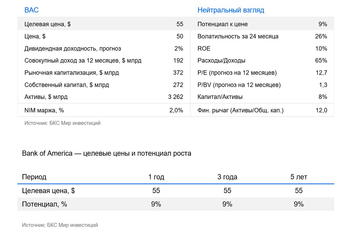 Предполагаемая доходность на собственный капитал без учета нематериальных активов в размере 13-14% в 2025-2027 годах будет примерно такой же, как у крупных конкурентов. Коэффициент расходов банка к его доходам (costs/income ratio или CIR) около 65%, в среднем диапазоне по сравнению с крупнейшими аналогами, что говорит о преимуществах долгосрочной стратегии Bank of America.
