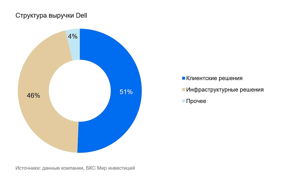 Dell Technologies Inc. (NASD: DELL) разрабатывает, производит, продает и обслуживает компьютерные решения. В сегменте инфраструктурных решений — системы для хранения данных, серверы общего назначения и оптимизированные для ИИ, сетевые решения для центров обработки данных и прочее. Сегмент клиентских решений — ПК, рабочие станции и ноутбуки, ПО и периферия. Dell основана в 1984 г. со штаб-квартирой в Раунд-Роке, штат Техас.