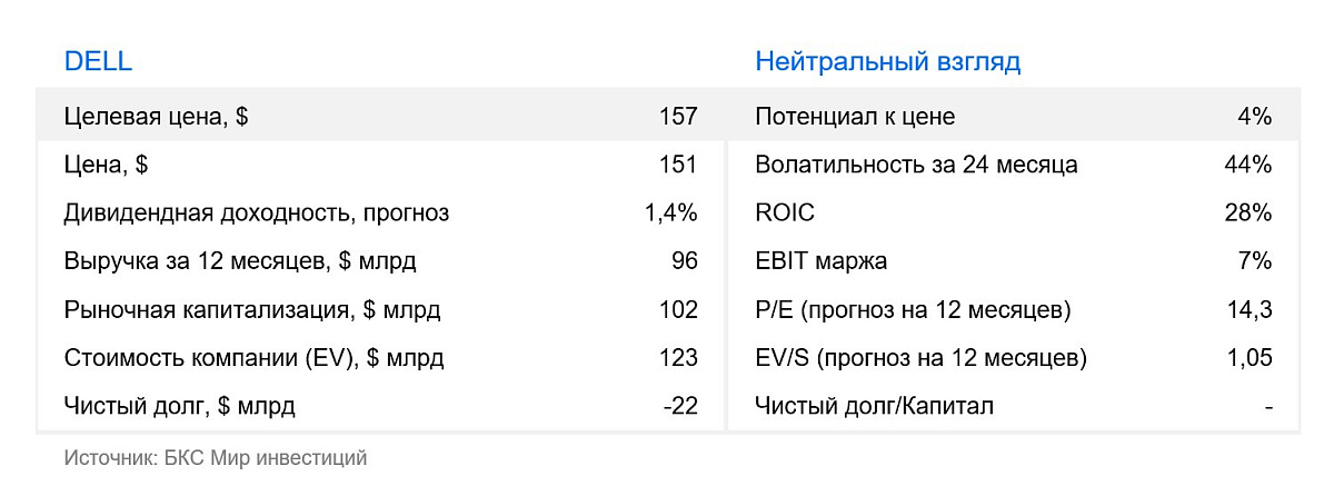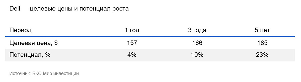 Наша оценка по методу дисконтирования денежных потоков и сравнительный анализ мультипликаторов с конкурентами также показывают, что акции Dell торгуются на справедливом уровне. Мы учитываем финансовые показатели, ведущие позиции на рынке и перспективы роста выручки от вложений в инфраструктуру ИИ, у нас «Нейтральный» взгляд с целевой ценой на уровне $156.