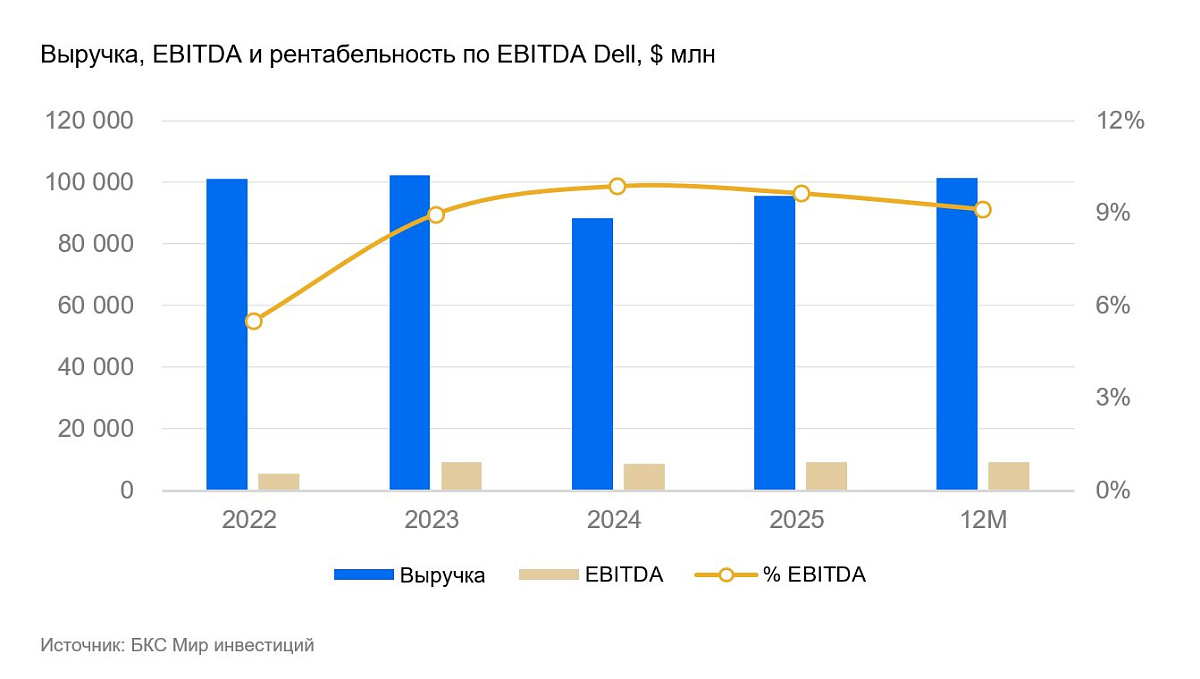 Повышенный интерес к решениям с ИИ также поддерживает общую рентабельность компании. В последнем квартале Dell увеличила долю этого сегмента в выручке до 44%. Так, скорректированная рентабельность EBITDA в 2024–2025 гг. достигла 11%, а в предыдущие два года она не превышала 10%. Мы оставляем прогноз рентабельности EBITDA на 2026–2027 гг. на уровне 11-11,5%. Мы опасаемся, что спрос может насытиться раньше и/или что может усилиться конкуренция.