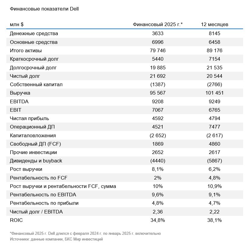 После обновленных ориентиров менеджмента мы подняли прогноз продаж в сегменте серверов и сетевых технологий с 27% до 45% на финансовый 2026 г. и с 5% до 15% на финансовый 2027 г. В прошлом году продажи выросли на 55–60%. Финансовый год у Dell начинается в конце января.
