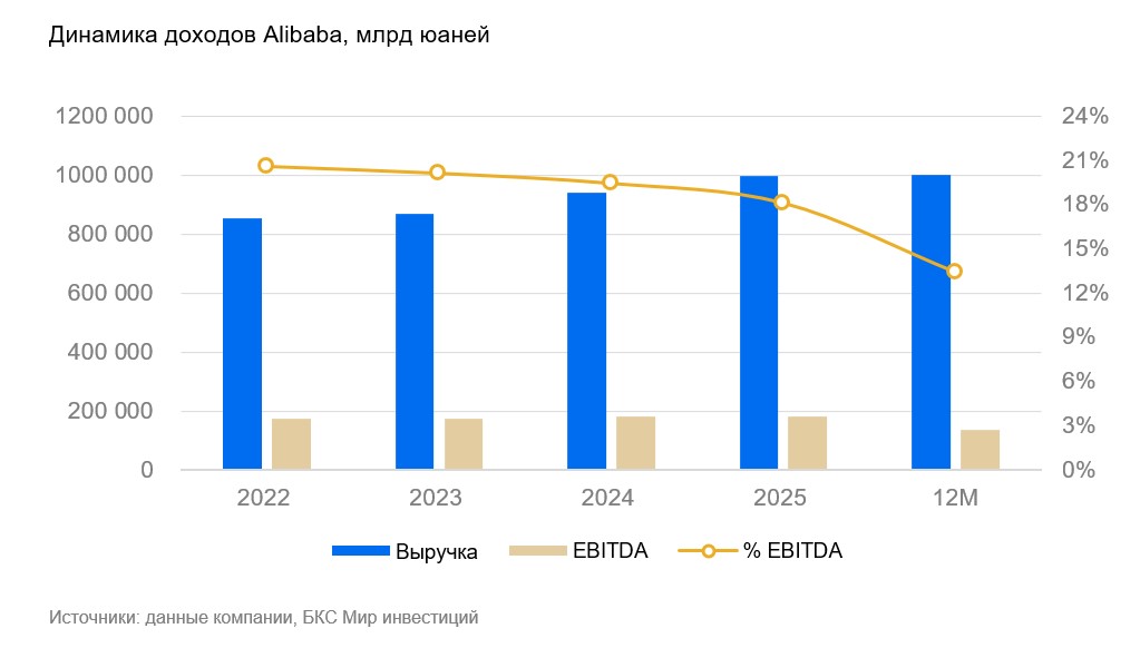 По итогам отчетности за I квартал 2026 финансового года (с 1 апреля по 30 июня) компания показала существенный рост выручки в сегменте облачных технологий, который стагнировал весь календарный 2024 г. Выручка в финансовом I квартале выросла за год на 26% до 33,4 млрд юаней. До этого за календарный 2024 г. выручка выросла на 7,5% по сравнению с 2023 г.