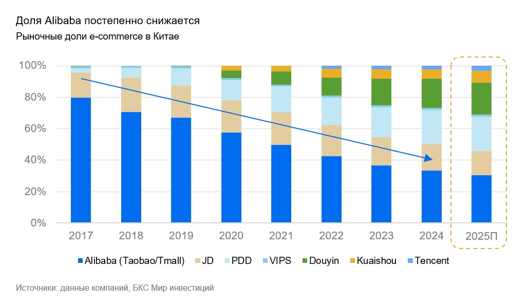 По состоянию на 2020 г. Taobao и Tmall Group (розничный сегмент Alibaba) занимал почти 60% внутреннего электронной коммерции (e-commerce) Китая. Ритейлер JD с 21% был на втором месте, Pinduoduo (PDD) с 13% — на третьем. Менее чем за 5 лет доля Alibaba сократилась до 35%, доля Pinduoduo (PDD) составила 21%, JD — 17%. Douyin, e-commerce платформа TikTok, нарастила рыночную долю до 19%, отразив новый тренд, когда не потребители ищут продукты, а стриминговые сервисы активно предлагают товары подписчикам.
