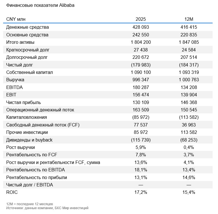 Несмотря на умеренный рост выручки и серьезное геополитическое давление, Alibaba сохраняет высокую маржинальность за счет операционной эффективности и масштаба. А поскольку капзатраты компании ограничены, она с 2024 г. начала платить дивиденды. Также Alibaba с середины 2022 г. выкупила с рынка 10% своих акций. В итоге за 2024 г. компания вернула акционерам порядка $30 млрд. Учитывая невысокую оценку бумаги в 2024 г., мы считаем такую аллокацию капитала эффективной и в интересах миноритариев. Отмечаем возможность более активного выкупа акций с рынка компанией при слабости котировок на фоне периодических ухудшений новостного фона в связи с торговыми противоречиями, хотя актуальность этого существенно снизилась в свете резкого роста котировок с конца августа.