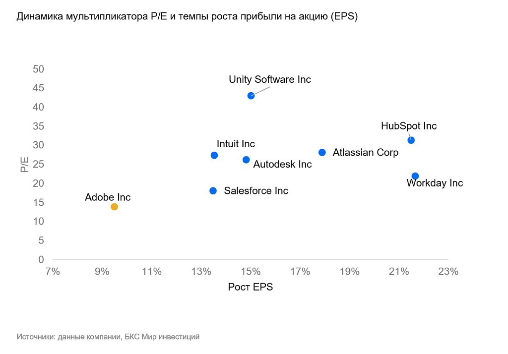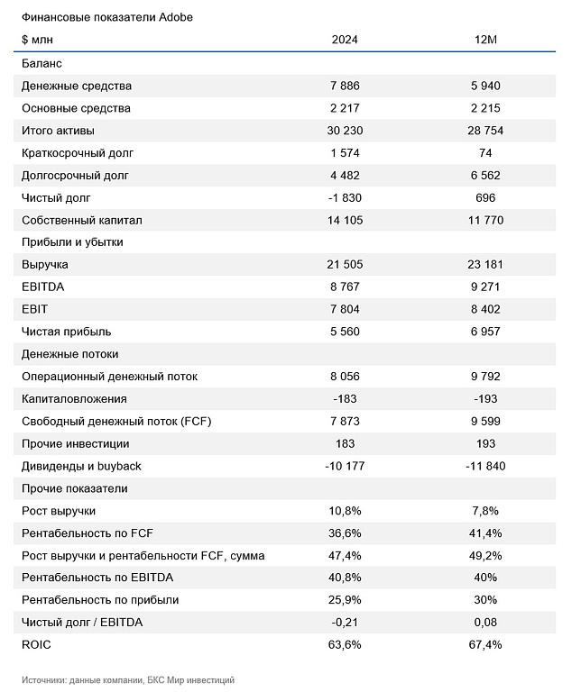 Также Adobe заявила о покупке онлайн-платформы для цифрового маркетинга и SEO (поисковой оптимизации) Semrush за $1,9 млрд. Этот актив поможет усилить позиции в ИИ и ПО для креаторов. Сделка предполагает оценку по форвардным мультипликаторам на 2026 г.: 3,1х по EV/S и 23х по EV/FCF (отношение стоимости компании к ее свободному денежному потоку). Несмотря на премию в 78% к текущим котировкам Semrush, считаем оценку адекватной, исходя из темпов роста выручки 15%. Также эта сделка не повлияет негативно на ликвидность Adobe, так как сумма не превышает квартальный операционный денежный поток, который по III кварталу составил $2,2 млрд.