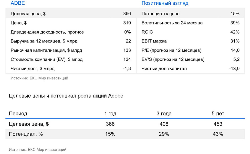 Текущая оценка Adobe по P/E выглядит относительно низкой по сектору ПО. Считаем, что весь негатив, связанный с замедлением роста бизнеса и высокой конкуренцией со стороны новых игроков в генеративном ИИ, уже заложен в котировки. Компания показывают маржу чистой прибыли на уровне 30% по стандартам GAAP, а также демонстрирует маржу свободного денежного потока (FCF) по итогам III квартала на уровне 35%. Прибыль распределяется через обратные выкупы акций, которые стабильно растут. Также компания направляет средства на сделки слияний и поглощений (M&A) для расширения продуктовой линейки и функционала. Считаем, что хоть и тренд на ИИ не драйвит котировки, но оценка и фундаментальная составляющая компании являются привлекательными. На горизонте 12 месяцев улучшаем взгляд с «Нейтрального» до «Позитивного», но понижаем целевую цену с $388 до $366.