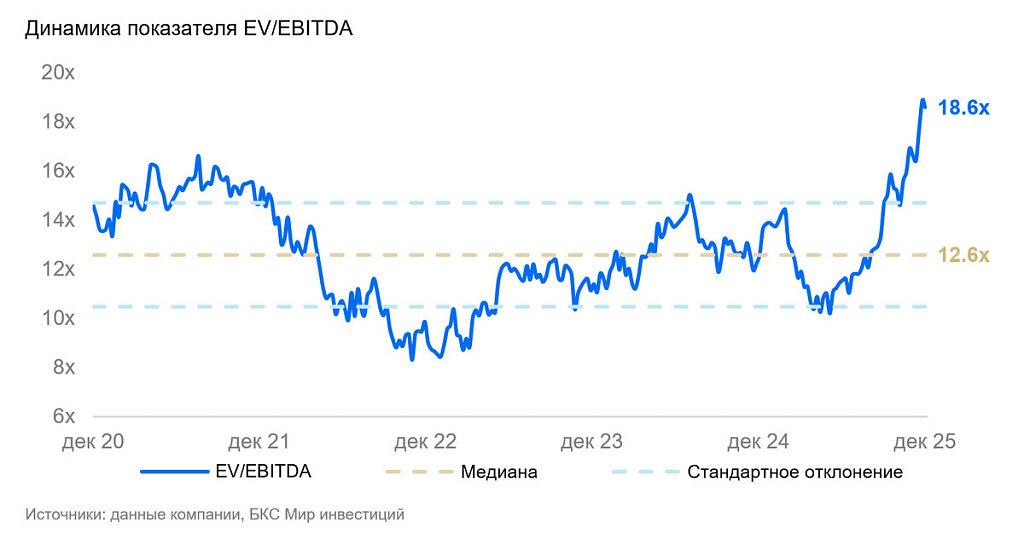 - Текущая оценка (EV/EBITDA 18,6x) на 48% выше среднего за 5 лет и значительно выше исторического диапазона, что усиливает риск коррекции