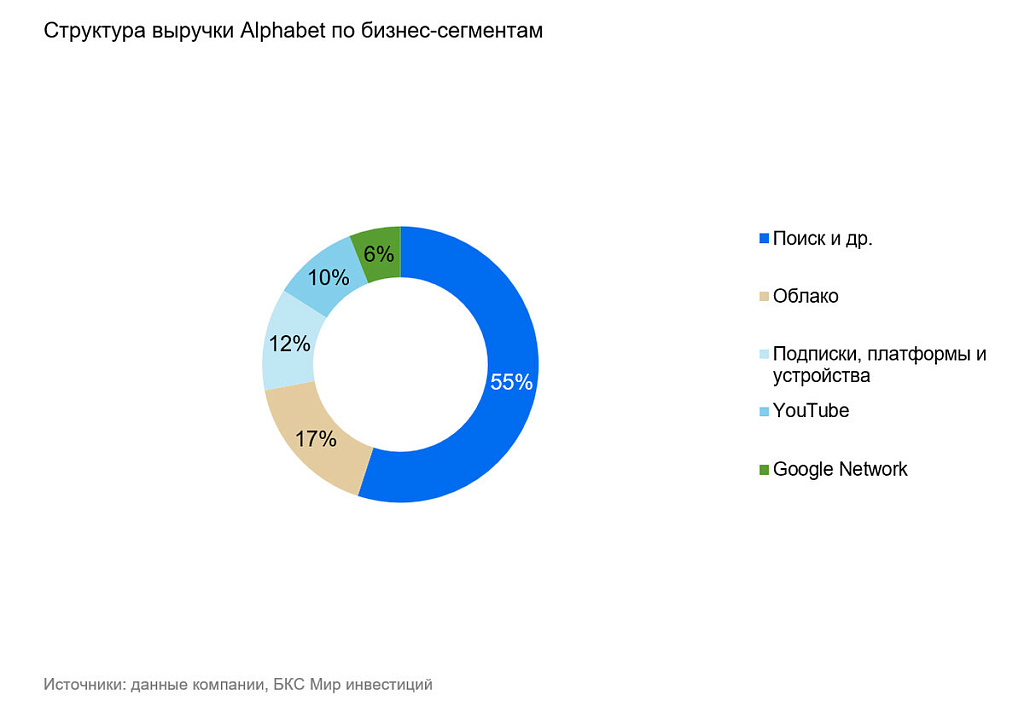 Alphabet (NASD: GOOGL) — холдинговая компания, владеющая Google и объединяющая ключевые технологические направления: поиск, цифровую рекламу, YouTube, Android, картографические сервисы и Google Cloud. Основу выручки формирует Google Search, а самым быстрорастущим сегментом остается облачное направление. Компания также инвестирует в развитие ИИ-технологий и инфраструктуры, включая модели нейросети Gemini, TPU-ускорители и сопутствующие продукты для корпоративных клиентов.