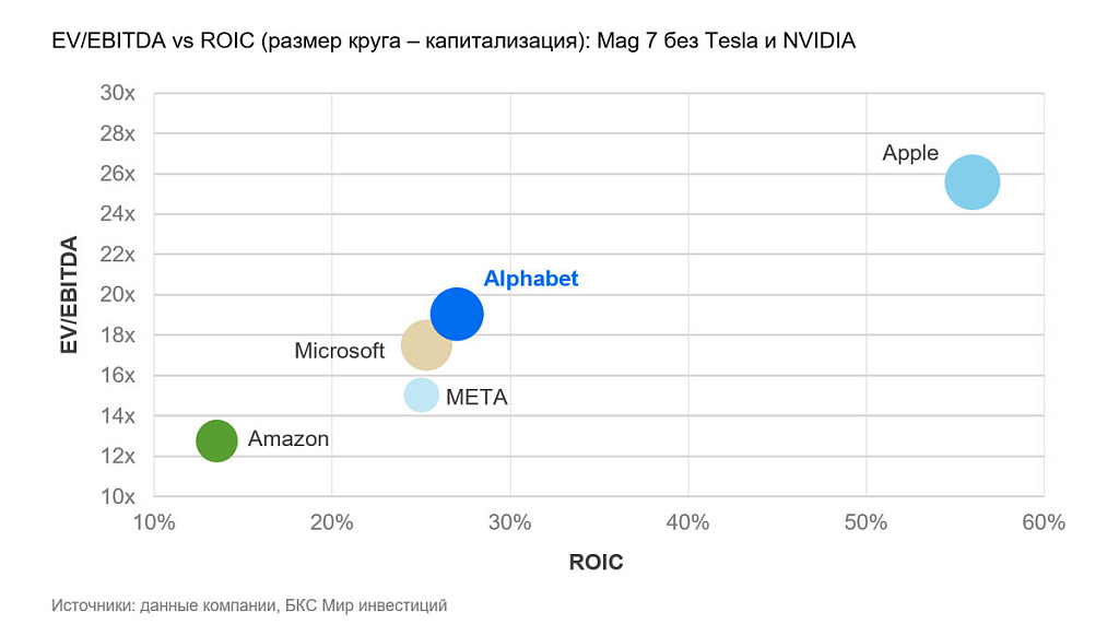 Финансовые результаты Alphabet подтверждают, что компания успешно сочетает инновационную активность с контролем эффективности. За последние 12 месяцев выручка выросла на 10% относительно полного 2024 г., а EBITDA-маржа увеличилась с 37% до 38%. ROIC в 27% выводит Alphabet на третье место среди Mag 7 — уступая только NVIDIA и Apple — и подчёркивает высокую отдачу капитала на зрелой стадии развития.