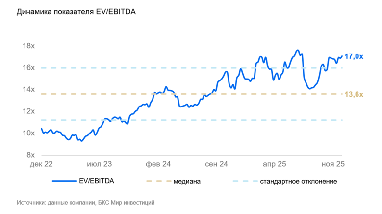 На фоне активной переориентации бизнеса в сторону искусственного интеллекта и гибридного облака оценка IBM существенно выросла. За последние два года акции компании подорожали примерно в два раза, несмотря на отсутствие сопоставимого ускорения фундаментальных показателей. В результате показатель EV / forward EBITDA в настоящее время примерно на 25% превышает свою медиану за последние три года, что указывает на заметное расширение мультипликаторов.