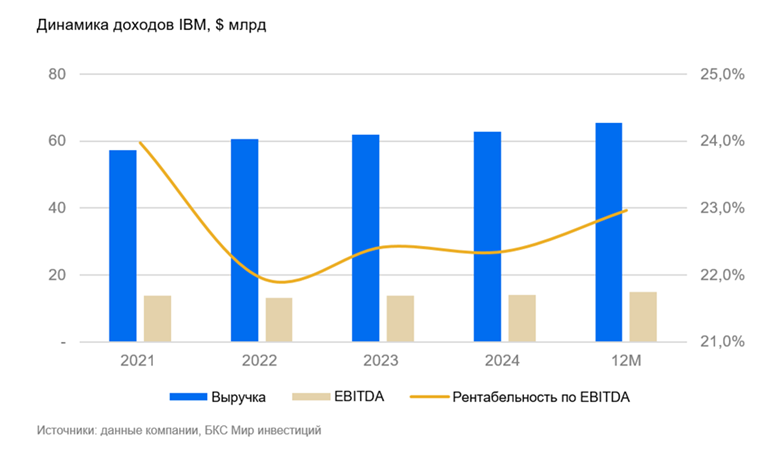 IBM представляет собой зрелый и относительно стабильный бизнес с предсказуемой операционной моделью и устойчивой маржинальностью. Рентабельность по EBITDA за последние 12 месяцев составляет около 23%, а в течение последних пяти лет находилась в узком диапазоне, колеблясь примерно в пределах 2 п.п., что подчеркивает устойчивость бизнеса. Дивидендная доходность составляет около 2%, при этом выплаты остаются стабильными и поддерживаются свободным денежным потоком.