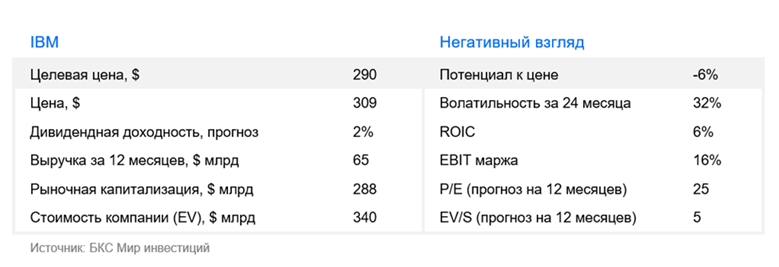 У нас «Негативный» взгляд на акции IBM. Несмотря на устойчивый денежный поток и стабильную маржу, компания остается зрелым бизнесом с ограниченными темпами роста. При этом текущая оценка отражает ожидания заметного улучшения рентабельности, возврата на инвестированный капитал и динамики роста. Дополнительным риском мы считаем ориентацию компании на сделки M&A как ключевой источник роста, что снижает финансовую гибкость и устойчивость инвестиционного кейса. В совокупности это повышает чувствительность текущей оценки к пересмотру рыночных ожиданий и поддерживает наш «Негативный» взгляд на акции IBM.