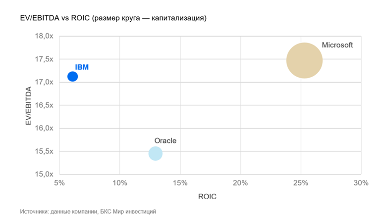 При этом текущая оценка IBM приблизилась к уровням компаний с принципиально иным финансовым профилем и динамикой роста. Акции компании торгуются почти на уровне Microsoft, которая демонстрирует существенно более высокие темпы роста прибыли и ROIC, превышающий показатели IBM примерно в четыре раза, а также выше оценок Oracle, которая обладает более высокой отдачей на инвестированный капитал. Таким образом, текущая оценка подразумевает заметное улучшение темпов роста, рентабельности и эффективности использования капитала по сравнению с историческим финансовым профилем IBM.