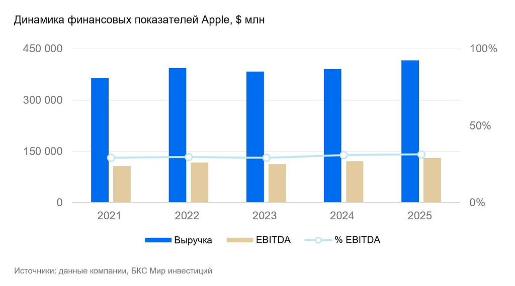 Единственным регионом, где выручка по итогам квартала снизилась, стал Китай: -4% г/г. Компания прямо связывает это с дефицитом поставок отдельных моделей iPhone. Таким образом, давление временно, но одновременно Apple подчеркивает чувствительность региона к любым операционным сбоям и усиливающейся конкуренции от локальных производителей.