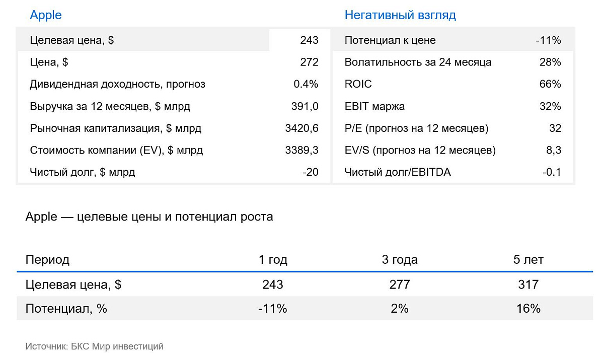 Среднесрочный рост выручки поддержат монетизация сервисов и развитие сегмента аксессуаров. Совокупно на них уже приходится порядка 25% выручки, и в ближайшие пять лет эта цифра увеличится до 36%. Рост доли сервисов в общей выручке усилит валовую рентабельность Apple, ведь у продуктов валовая маржа — 35%, а у сервисов — 70%. В ближайшей перспективе Apple может продемонстрировать умеренный рост благодаря стабильному бизнесу сервисов, который происходит благодаря более чем 2,2 млрд активных устройств. Новые функции ИИ могут способствовать циклу обновления продуктов в среднесрочной перспективе, но, по нашему мнению, это не будет иметь массовый характер. Производство в Китае может помешать выполнять заказы в случае нехватки комплектующих или геополитических проблем.