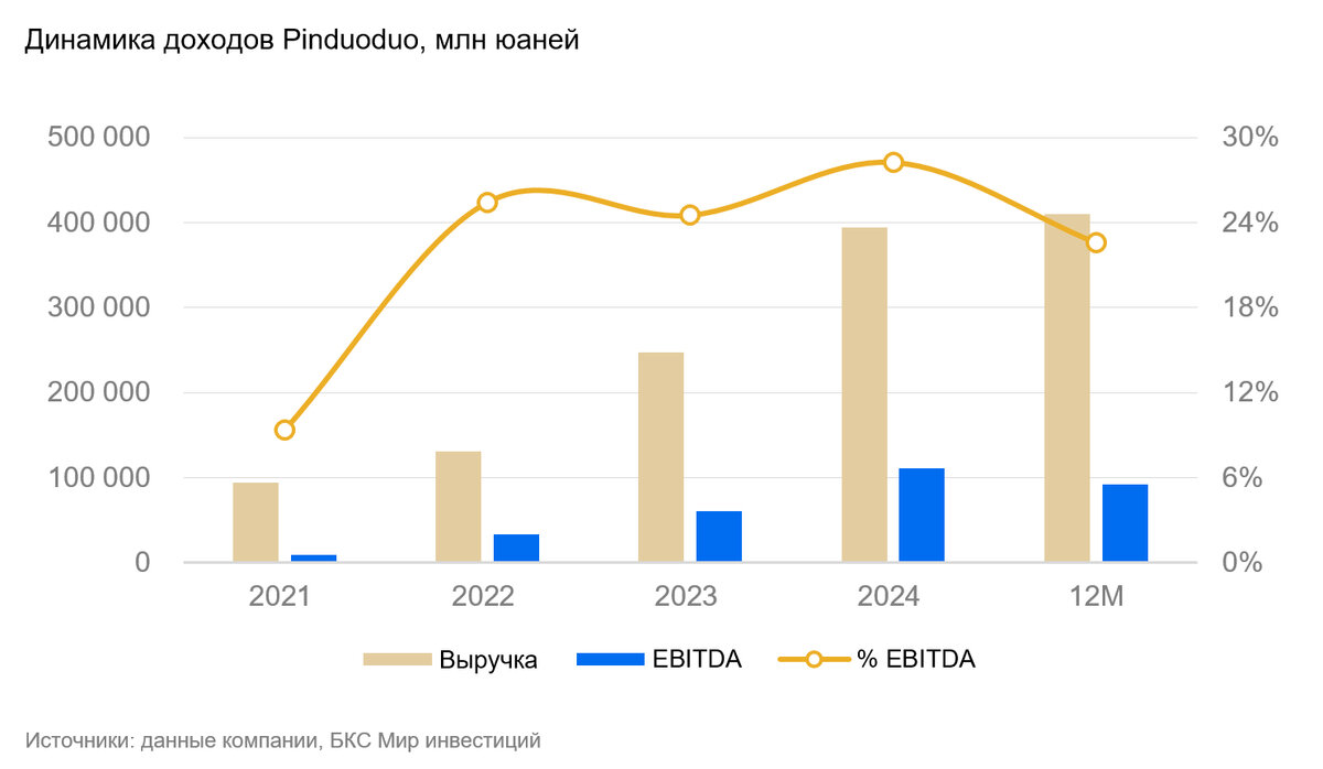 За 2024 г. MAU (среднее количество пользователей) платформы вырос на 180%. По этому показателю Pinduoduo опередила всех крупнейших конкурентов, кроме Amazon и Alibaba, динамика которых по приросту MAU за тот же период оказалась в диапазоне от 0 до 5%. Такого преимущества удалось добиться за счет лидерства в ценовом предложении и затратах благодаря эффективной логистике, прежде всего, на западных рынках. Таким образом, Pinduoduo находился в стадии структурного роста и отнимает долю рынка у конкурентов.