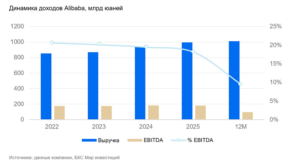 Во II квартале финансового 2026 г. (с 1 июля по 30 сентября) выручка в сегменте облачных технологий выросла на 34% в годовом сопоставлении и составила почти 40 млрд юаней. Годовой рост ускорился еще сильнее по сравнению с I кварталом (+26%). В календарном 2024 г. рост стагнировал весь год и составил 7,5% к 2023 г.