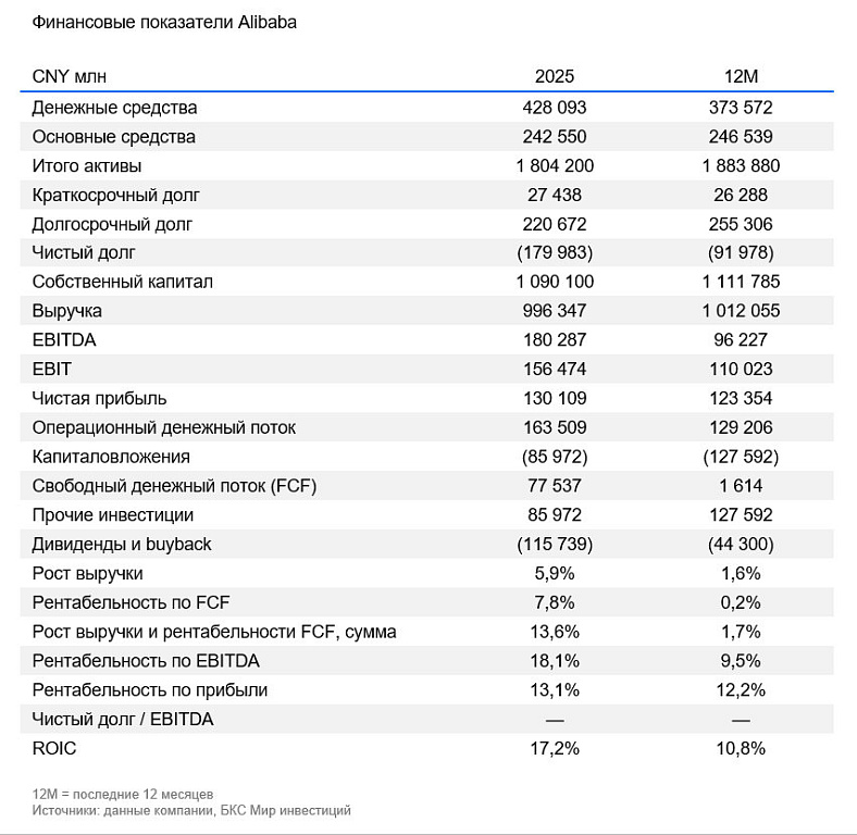 Внедрение ИИ стало мощным драйвером капитализации: в августе акции Alibaba подорожали более чем на $50 млрд, что позволило компании обогнать конкурентов по динамике роста. Ранее Alibaba объявила о планах направить до 50 млрд юаней на субсидии в сфере локальных сервисов, а ее бизнес в сфере электронной коммерции за 2025 г. сформировал свыше 1,5 трлн юаней онлайн-продаж. Таким образом, обширные инвестиции в Amap и внедрение ИИ подтверждает устойчивость бизнес-модели Alibaba и повышает ее целевые мультипликаторы при сравнительной оценке, что приводит к повышению целевой цены.