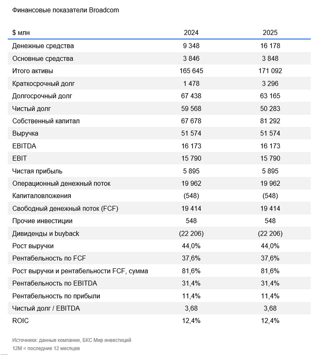 Broadcom, крупный разработчик решений для полупроводников и инфраструктуры, продолжает демонстрировать сильные результаты. Причина в росте спроса на полупроводниковые чипы и сетевое оборудование в связи с развитием и интеграцией ИИ технологическими платформами. Результаты IV квартала и прогнозы менеджмента поддерживают эту тенденцию. Крупнейшие клиенты компании — Google, Meta, ByteDance (TikTok), OpenAI, Anthropic и другие. Они обеспечивают рост продаж, в первую очередь, специализированных ИИ-чипов.