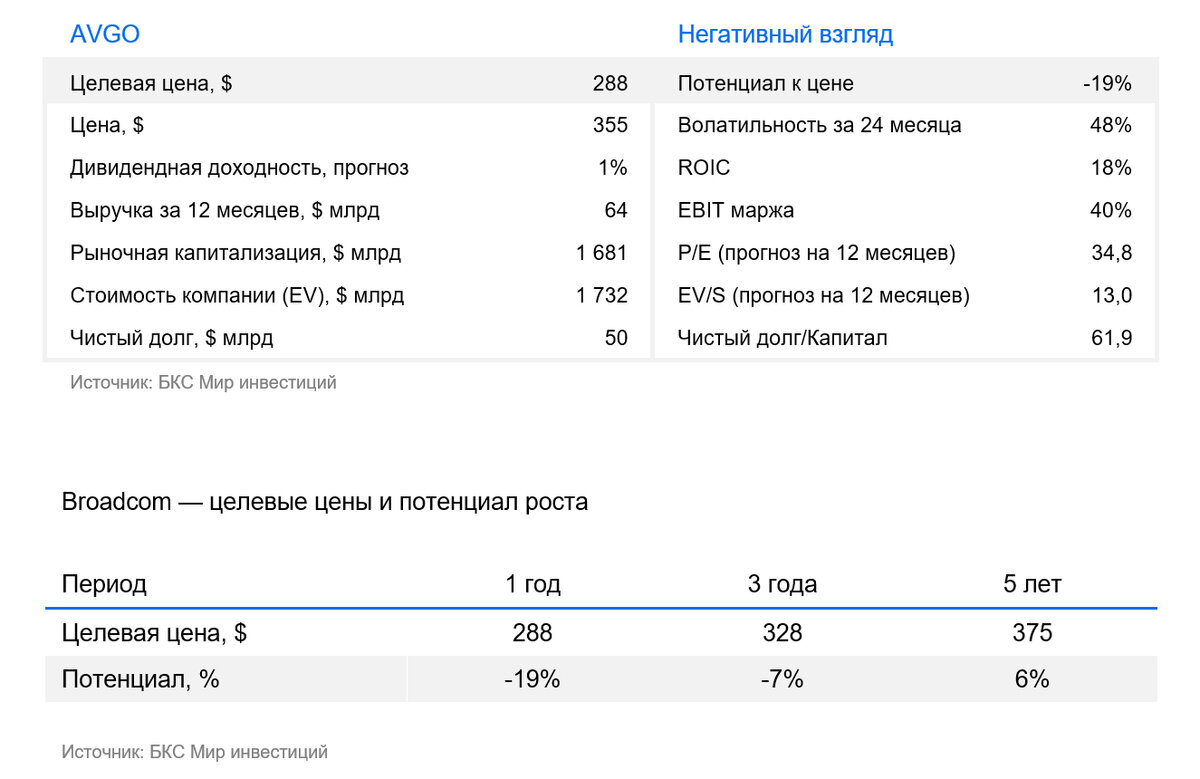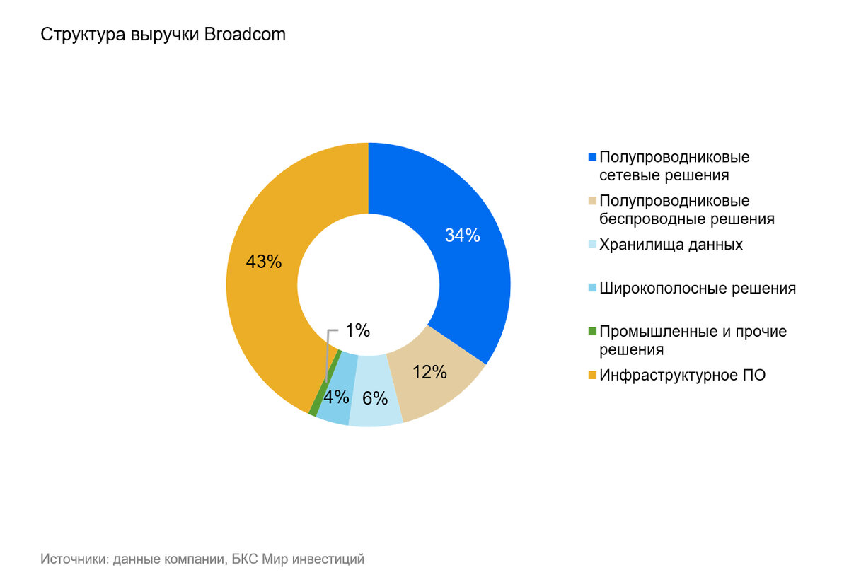 Broadcom (NASD: AVGO) — технологическая компания, специализирующаяся на разработке программного обеспечения для полупроводников и инфраструктуры. Клиентами являются банки, страховые и государственные компании, а также крупнейшие корпорации, такие как Apple, Samsung, Xiaomi, Asus. Компания известна своими высокопроизводительными возможностями проектирования и интеграции и предлагает специализированные кремниевые решения для коммутации и маршрутизации Ethernet, оптические компоненты, радиочастотные интерфейсные модули и специализированные интегральные схемы (ASIC).