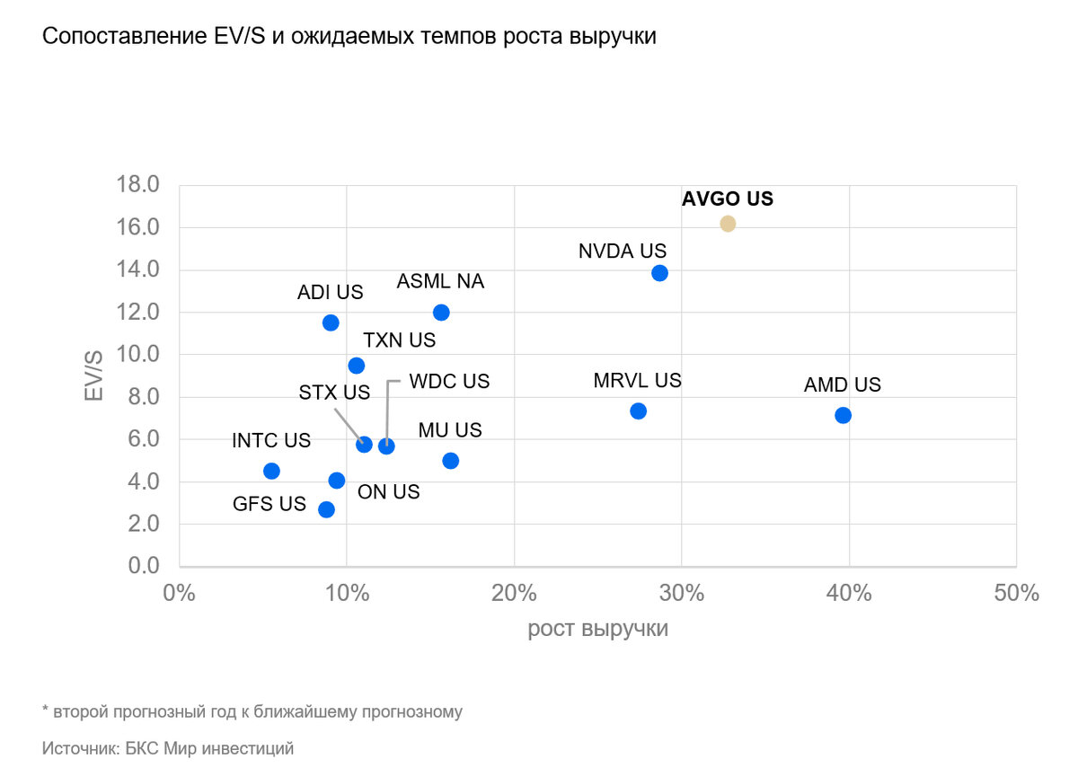 Акции Broadcom торгуются с мультипликатором P/E 32x, на 30% выше медианного значения по сектору (24,6х) и на 21% — собственного среднего значения за последние 5 лет (26,5x). А по EV/S — на уровне 16,2x. Это самая дорогая компания сектора, что связано с ожиданиями продолжения быстрого роста выручки и сохранения маржинальности.