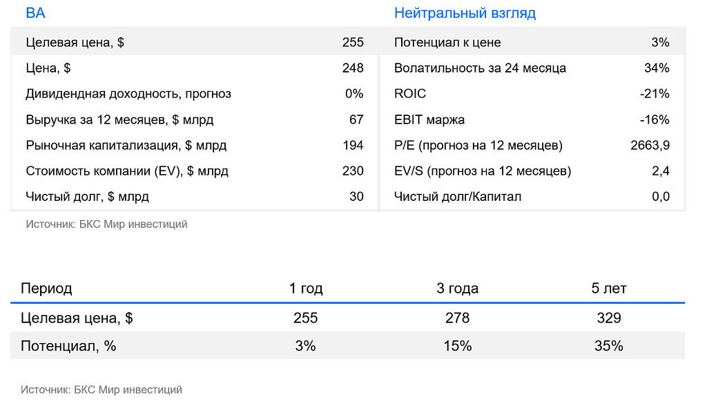 Оценка существенно выросла, и в последний год акции торгуются на уровне 1 стандартного отклонения от исторических средних по форвардному EV/EBITDA, что говорит о перекупленности акций. Причиной стал всплеск заказов. Однако считаем, что пока позитив, связанный с увеличением бэклога и выполнением заказов, сохраняется, акции продолжат растущий тренд. В связи с этим сохраняем «Нейтральный» взгляд на акции Boeing и повышаем целевую цену с $201 до $255 на горизонте 12 месяцев.