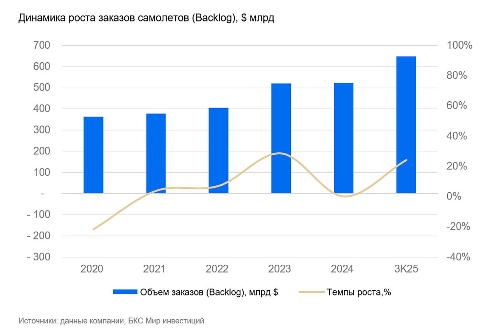 В III квартале роста заказов самолетов Boeing ускорился: +24% к значениям конца 2024 г., до максимума в $648 млрд.