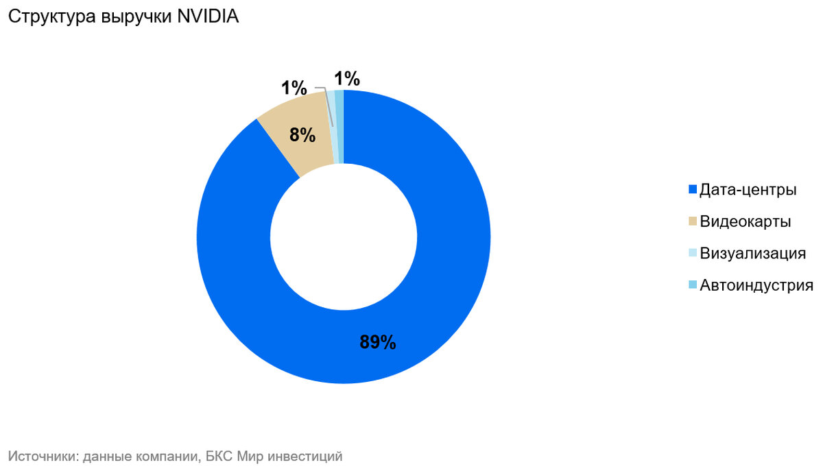 NVIDIA (NASD: NVDA) разрабатывает микросхемы для графических процессоров. Компания представлена в пяти сегментах: дата-центры (дизайн микросхем для анализа данных, обработки графики, искусственного интеллекта), игровой сегмент (видеокарты для ПК), визуализация, сегмент чипов для автопрома (системы автономного вождения) и разработки для производителей ПК. Продукция NVIDIA производится на заводах TSMC, Samsung, Micron и других. Заказчиками выступают производители ПК (Dell, HP, Lenovo) и пользователи облачной инфраструктуры (Amazon, Alphabet, Microsoft).