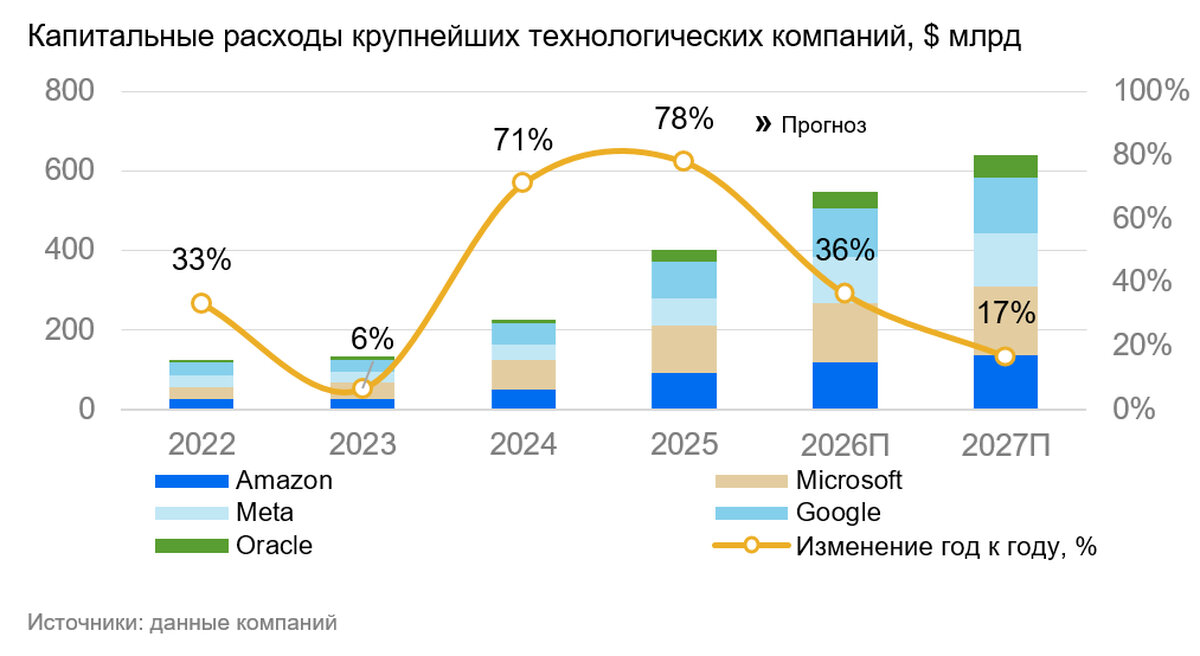 Замедление роста капрасходов мы во многом связываем с тем, что модели монетизации и отдача по-прежнему вызывают вопросы. Так, компания OpenAI, лидер в разработке ИИ, несмотря на огромный объем объявленных перспективных закупок чипов на ближайшие 5–7 лет (десятки миллиардов в год) пока не может похвастаться даже сопоставимой выручкой (по оценкам, она вышла на уровень $15–20 млрд в год к концу 2025 г.).