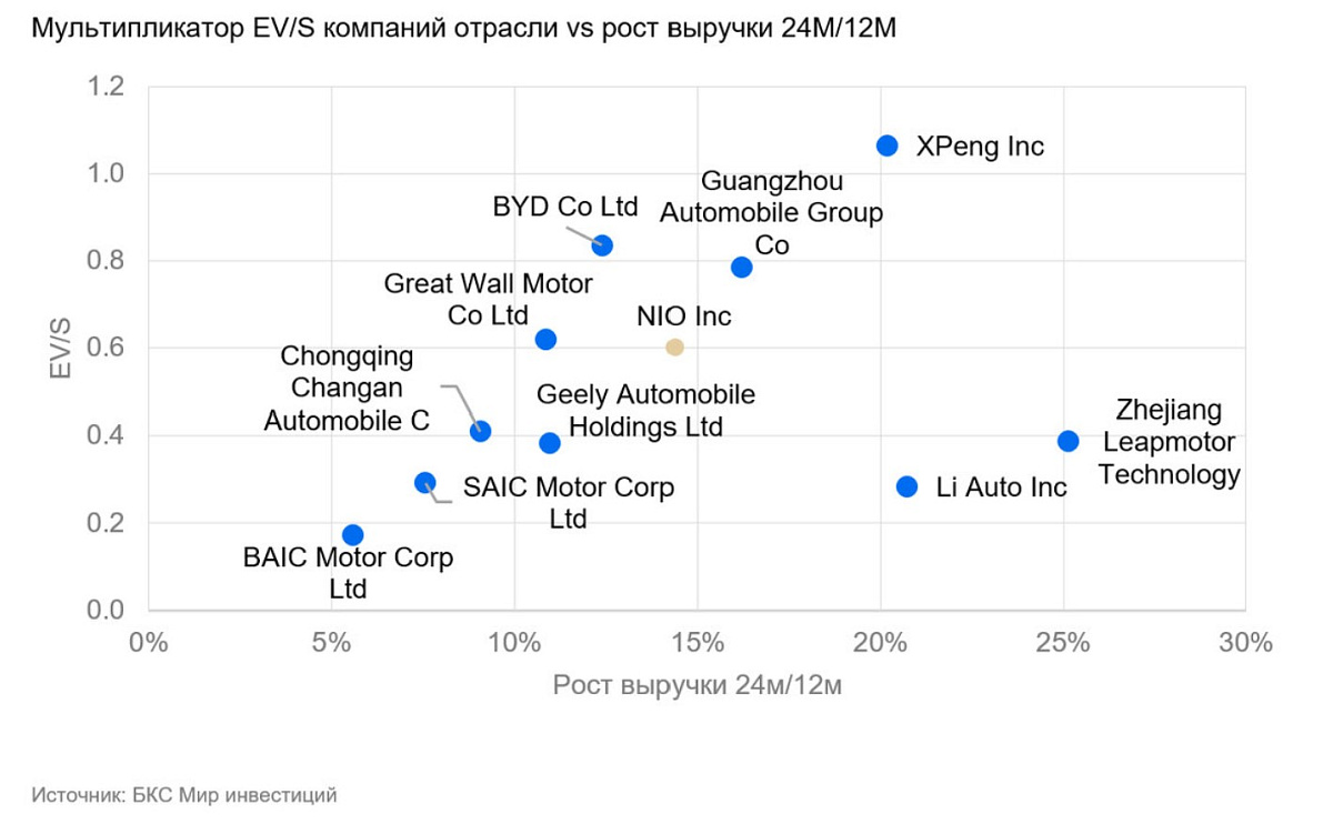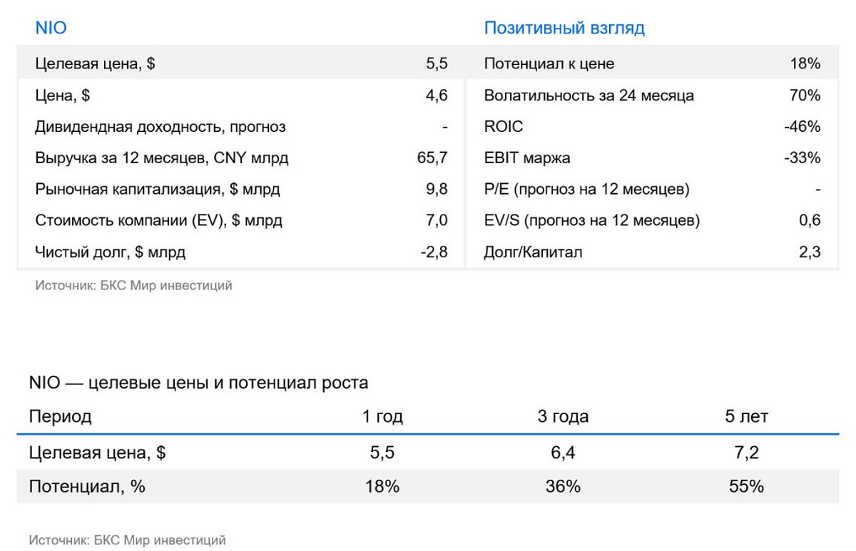 Текущий мультипликатор EV/Sales NIO равен 0,6х, что соотносится с оценкой аналогов. Новая целевая цена — $5,5, при потенциале роста — 18%. Оценка очень чувствительна к прогнозам продаж и маржинальности, поэтому бумага может растерять свой потенциал роста или упасть в случае отклонения фактических показателей от ожиданий.