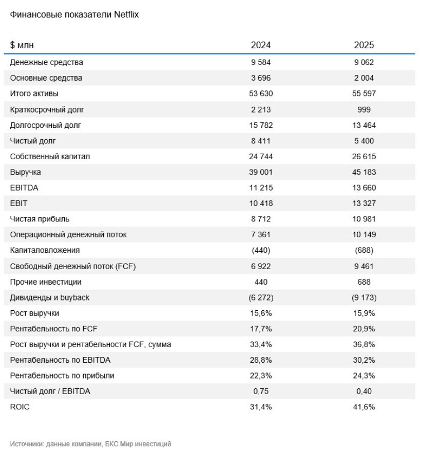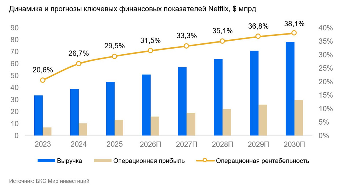 Netflix на 2026 г. прогнозирует выручку в диапазоне $50,7–51,7 млрд, что соответствует росту примерно на 12–14% год к году. Операционная маржа ожидается на уровне около 31,5%, что несколько ниже ожиданий аналитиков. Компания также прогнозирует резкое ускорение рекламного бизнеса: рекламная выручка в 2026 г., по оценке менеджмента, может увеличиться примерно в 2 раза по сравнению с 2025 г. Рост подписчиков ожидается более умеренным, при этом акцент будет сделан на монетизацию существующей базы и расширение предложения в странах с более низким ARPU.