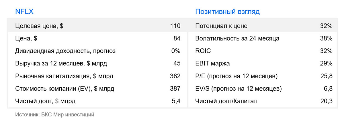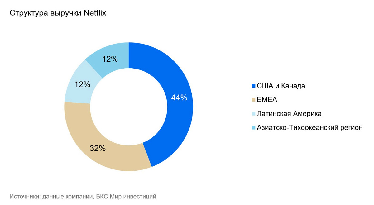 Netflix (NASD: NFLX) — американская компания, владелец крупнейшего в мире стримингового сервиса. Netflix доступен более чем в 190 странах. На конец 2025 г. число подписчиков перевалило за отметку 325 млн. Netflix зарабатывает на ежемесячной подписке на сервис потокового видео с крупной базой контента. Это художественные и документальные фильмы, мультфильмы и сериалы. Компания активно создает собственный контент: это сериалы «Очень странные дела», «Ведьмак», «Эмили в Париже» и «Игра в кальмара», а также художественные фильмы «Не смотрите наверх», «Птичий короб», «Ручная кладь» и другие.