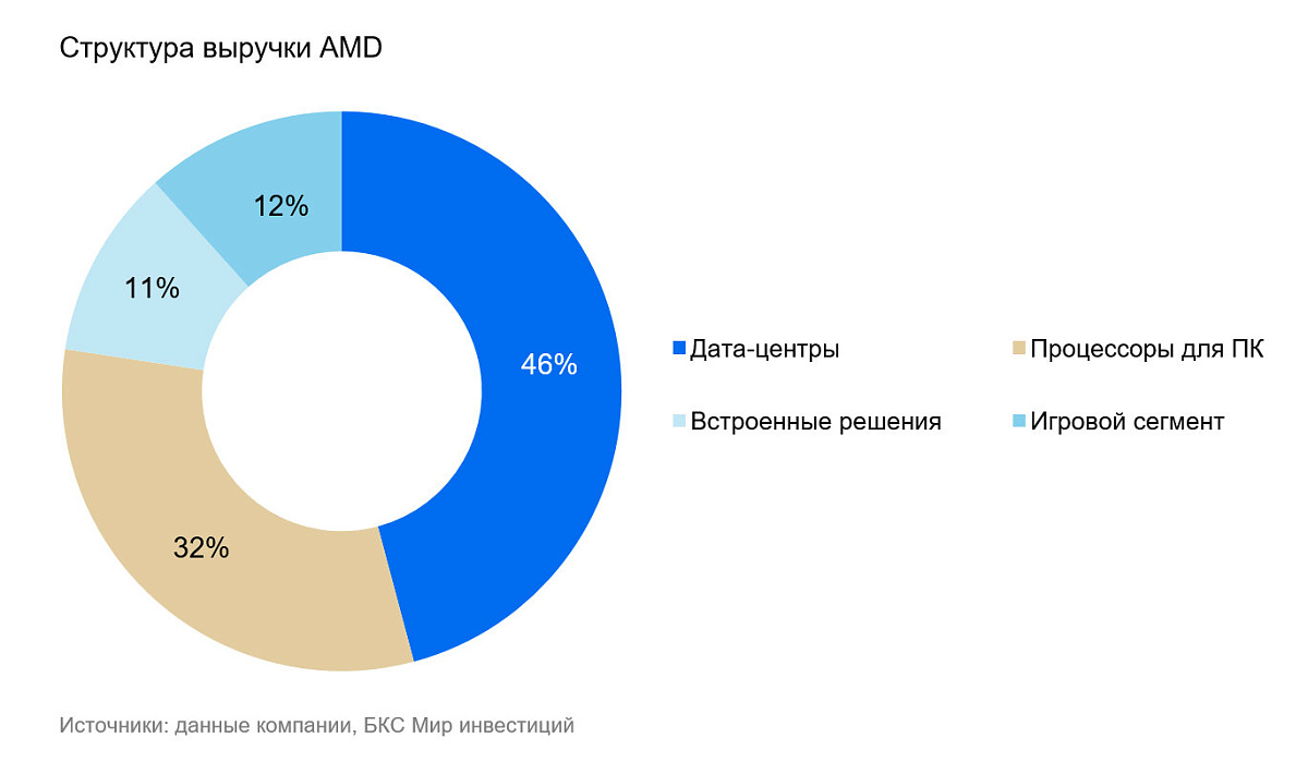 Advanced Micro Devices (NASD: AMD) разрабатывает центральные и графические процессоры для ПК, ноутбуков и серверов под брендами Ryzen, Athlon, EPYC и Radeon, а также оборудование для ИИ (MI300X). Физическое производство отдано на аутсорсинг крупнейшим компаниям — GlobalFoundries и TSMC (тайваньский производитель полупроводников). Выручка AMD превышает $25 млрд в год. Клиенты компании: Dell, Lenovo, HP, Acer, Microsoft, Sony, Google, Oracle, Tencent, Alibaba, OpenAIи прочие.