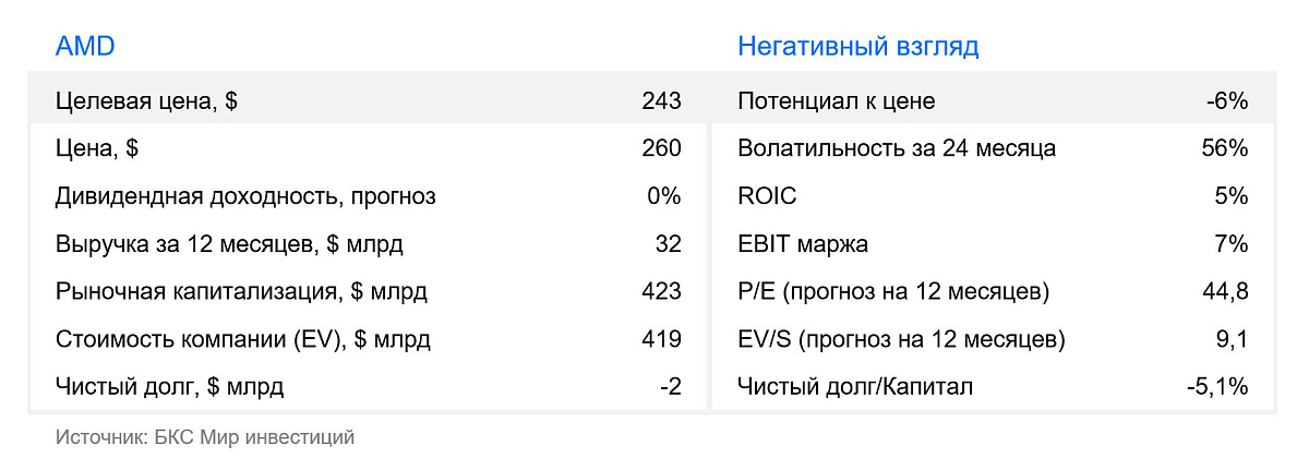 Поэтому на горизонте 12 месяцев мы устанавливаем «Негативный» взгляд на акции AMD ввиду высокой чувствительности оценки компании к общим перспективам сектора.