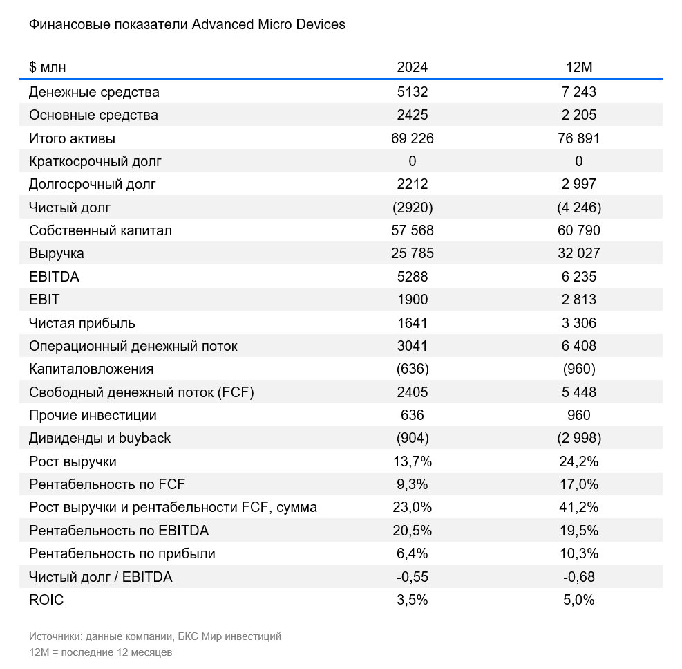 В последнее время результаты AMD лучше рынка за счет технологически сильных продуктов — серверных процессоров EPYC и графических ускорителей MI300X и MI325X.