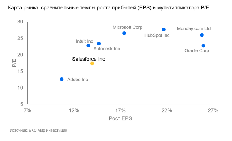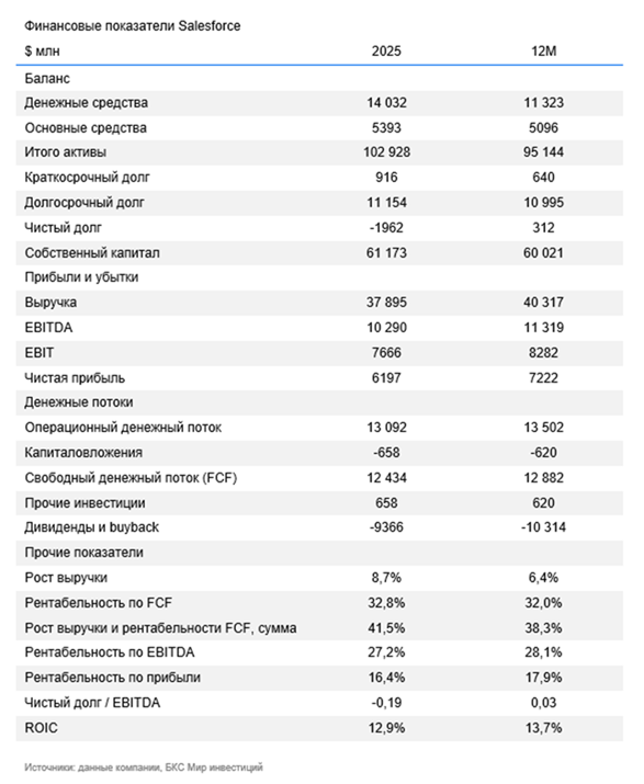 2025 год стал слабым для Salesforce: при росте широкого рынка (S&P 500) с начала года на 16% акции компании снизились в цене на 21%. Salesforce оказался среди аутсайдеров рынка из-за сочетания стратегических и оценочных факторов. На фоне широкого инвестиционного бума в ИИ компания придерживалась сравнительно сдержанного подхода к таким вложениям, что усилило опасения инвесторов относительно ее позиции в долгосрочной технологической гонке. В результате, несмотря на фундаментально устойчивый бизнес, стабильные денежные потоки и улучшение операционных показателей, Salesforce воспринимается рынком как зрелая компания с умеренными темпами роста. При этом сектор корпоративного ПО в течение 2025 г. также оставался под давлением, особенно компании без фокуса на ИИ, и лишь отдельные игроки показывали рост, в отличие от повсеместного роста сектора полупроводников.