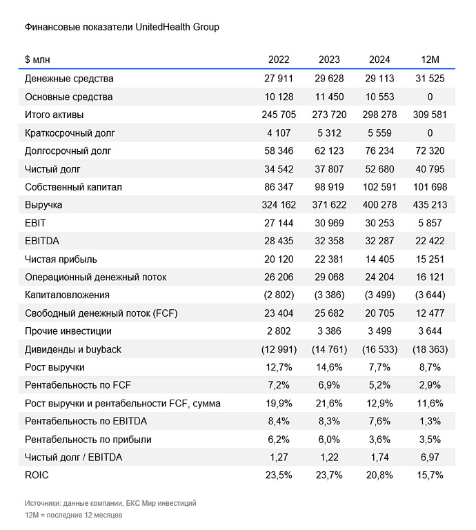 - Операционные риски в клиниках Optum Health. Сложность интеграции клиник и лечение тяжелобольных пациентов временно снижает рентабельность. Если эффективность Optum Health не восстановится, может замедлиться рост прибыли всей группы.