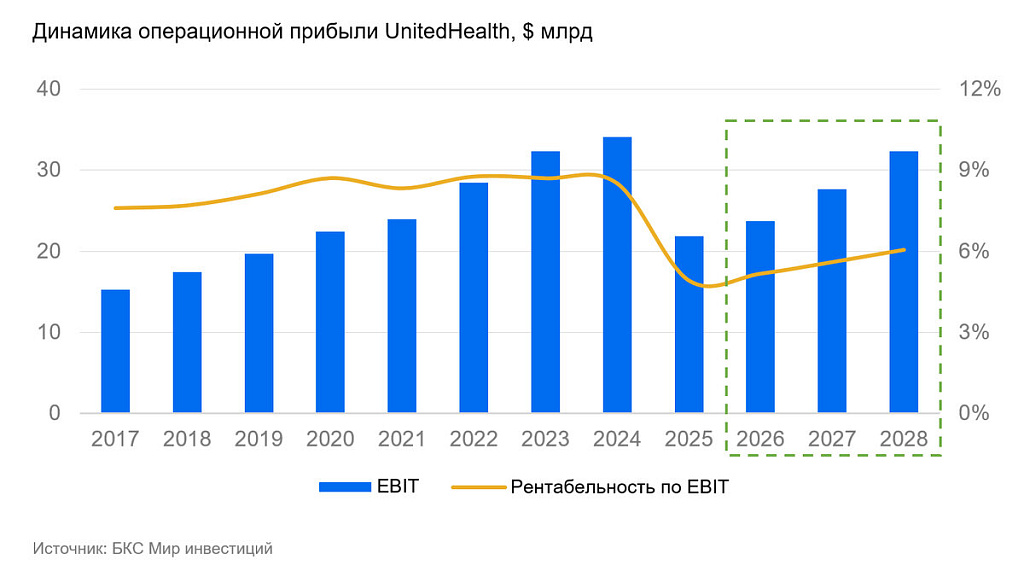 Отраслевые аналитики ожидают, что дно цикла придется на 2025 г., а восстановление начнется с 2026 г., когда пересмотр ставок по программам Medicare Advantage и Medicaid, а также нормализация числа обращений начнут возвращать сектор к прежней рентабельности и росту прибыли на акцию к 2027 г.