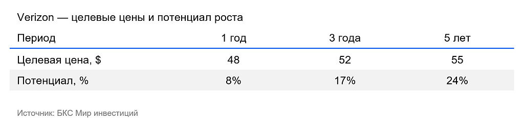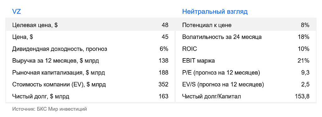Сейчас мультипликатор EV/EBITDA Verizon находится чуть ниже исторического медианного значения. Однако после недавнего скачка цены акций мы снижаем взгляд на акции компании до «Нейтрального». Наша целевая цена — $48 за акцию с потенциалом роста 8%.