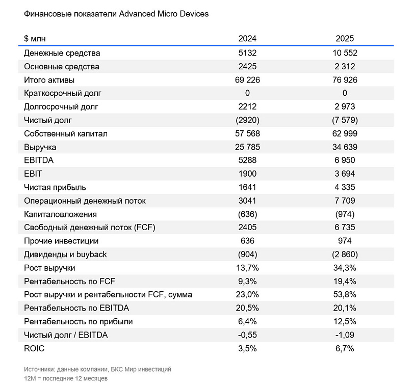 Валовая рентабельность еще выросла за счет операционного рычага, достигнув 57% (или 54% по GAAP). Это также поддержало прибыльность (чистая прибыль +40% год к году) и обеспечило свободный денежный поток более $2 млрд на фоне рекордных продаж флагманских процессоров EPYC, Ryzen и Instinct.