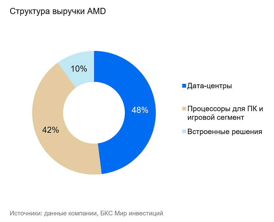 Advanced Micro Devices (NASD: AMD) разрабатывает центральные и графические процессоры для ПК, ноутбуков и серверов под брендами Ryzen, Athlon, EPYC и Radeon, а также оборудование для ИИ (MI300X). Физическое производство отдано на аутсорсинг крупнейшим компаниям — GlobalFoundries и TSMC (тайваньский производитель полупроводников). Выручка AMD превышает $32 млрд в год. Клиенты компании: Dell, Lenovo, HP, Acer, Microsoft, Sony, Google, Oracle, Tencent, Alibaba, OpenAI и прочие.