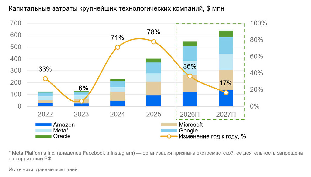 - Основной драйвер — сегмент дата-центров (решений для ИИ), в 2026 г. ожидается +55%, но по сектору в целом рост замедляется
