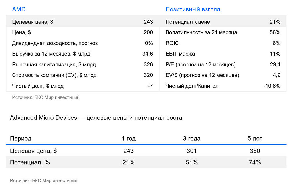 Поэтому на горизонте 12 месяцев мы устанавливаем «Позитивный» взгляд на акции AMD благодаря адекватной оценке и сильной конкурентной позиции.