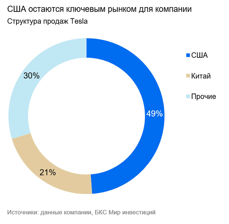 Ключевой регион продаж для Tesla — США, где в 2024 г. компания получила 49% своей выручки. Однако там потребители все чаще выбирают не полностью электрические автомобили, а гибридные модели, которые позволяют владельцам не зависеть от сети зарядных станций.