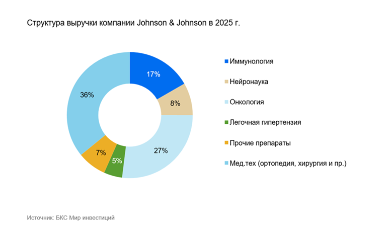 Johnson & Johnson (NYSE: JNJ) — один из крупнейших и наиболее диверсифицированных мировых игроков в сфере здравоохранения. Компания разрабатывает, производит и коммерциализирует инновационные лекарственные препараты и медицинские устройства, занимая ведущие позиции в сегментах Innovative Medicine (64% от выручки) и MedTech(36%). Компания оперирует более чем в 60 странах и входит в число глобальных лидеров по объему инвестиций в научно-исследовательские разработки в области медицины. Основана в 1886 г., базируется в Нью-Брансуике (США).
