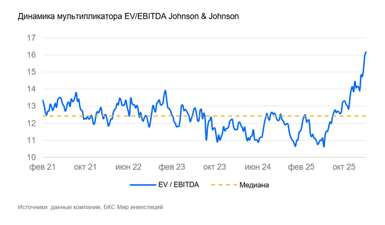 За последние 12 месяцев акции Johnson & Johnson выросли в цене более чем на 55% на фоне улучшения ожиданий по росту выручки. В результате текущий форвардный мультипликатор EV/EBITDA на уровне 16,2x существенно превышает историческую медиану (12x), что отражает уже состоявшую переоценку бизнеса и снижение дисконта за неопределенность.